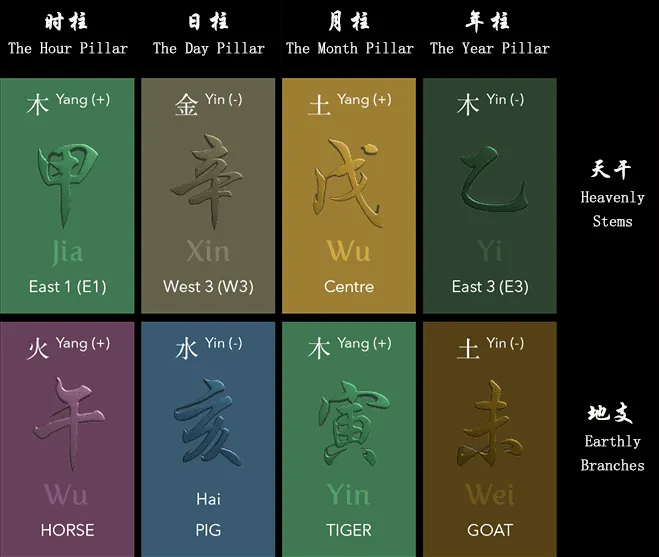 八字,也被稱為天命四柱,是中國古代的一種形而上學體系,根據年、月、日和出生時間分析一個人的出生圖。 這些“支柱”中的每一個都代表了一種元素——木、火、土、金屬和水——以及它們之間的相互作用。