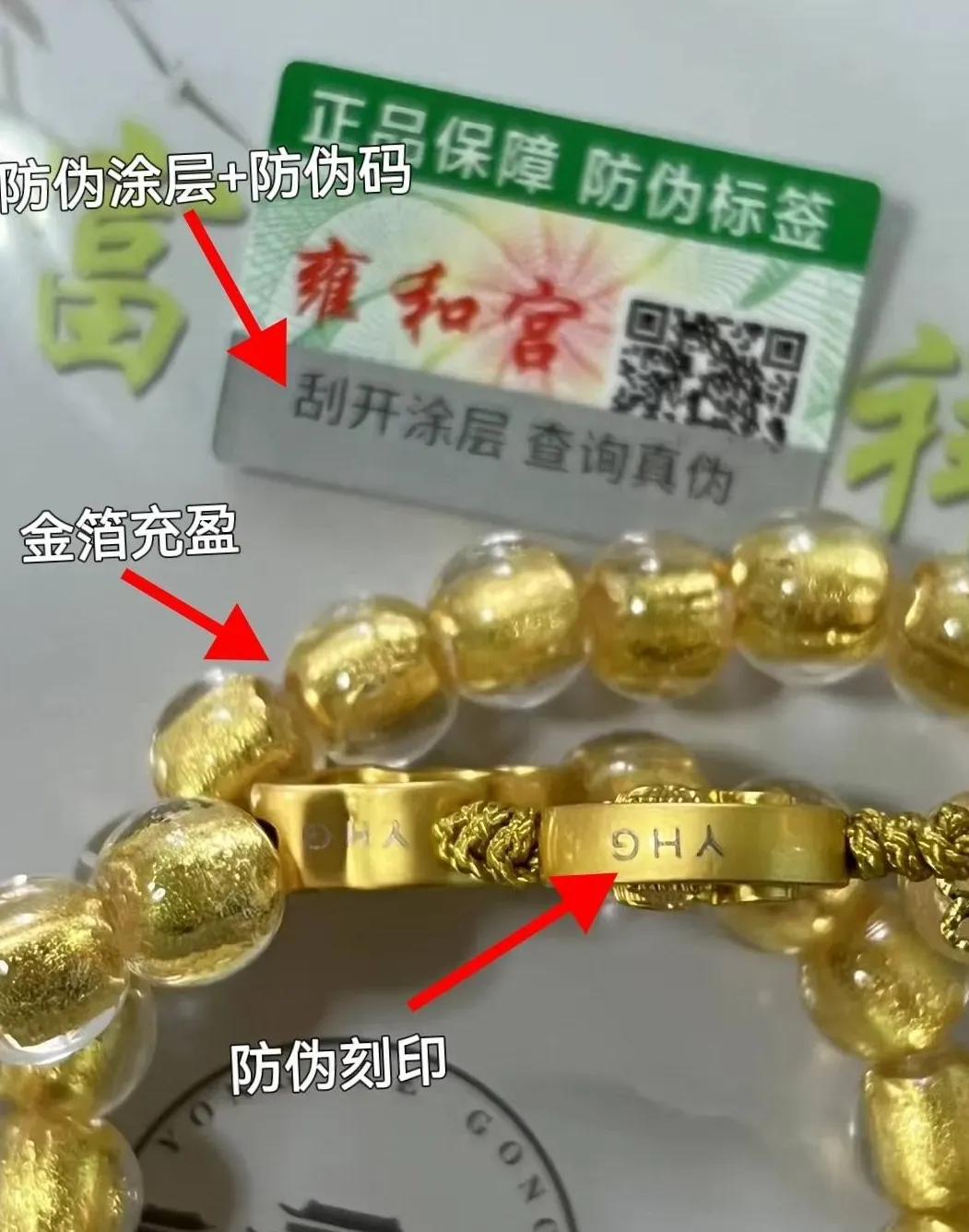 📍這是我們給雍和宮獨家供應的款式,正品金箔手鏈請認準「吊墜防偽刻印」和「防偽碼」,詳見最後一張圖。